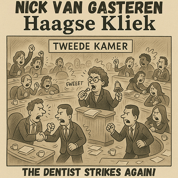 Omdat hij als tandarts altijd zeer nauw betrokken was bij het welzijn en de zorg voor zijn medemens, lanceert Nick van Gasteren nu dus ‘Haagse Kliek’, een schotschrift richting Den Haag op de wijs van Purple Rain, met jammer genoeg een hoog waarheidsgehalte.